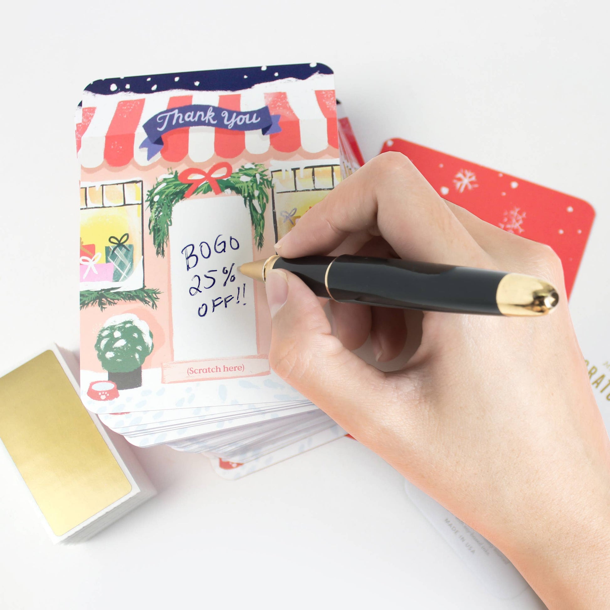Create your own scratch-off cards to build loyalty and customer retention! Each set includes 100 blank cards and 100 stickers with instructions. Using a ballpoint pen, write a short message or discount and cover it with the included scratch-off sticker.