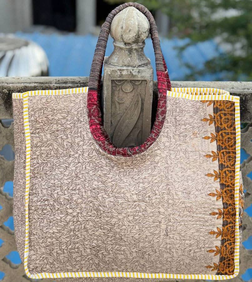 Silk quilted travel bag made by Indian Artisans, This Silk quilted shopping bag is totally unique and multi purpose. Use this for your grocery or as a travel bag. Perfect to suit everyone.