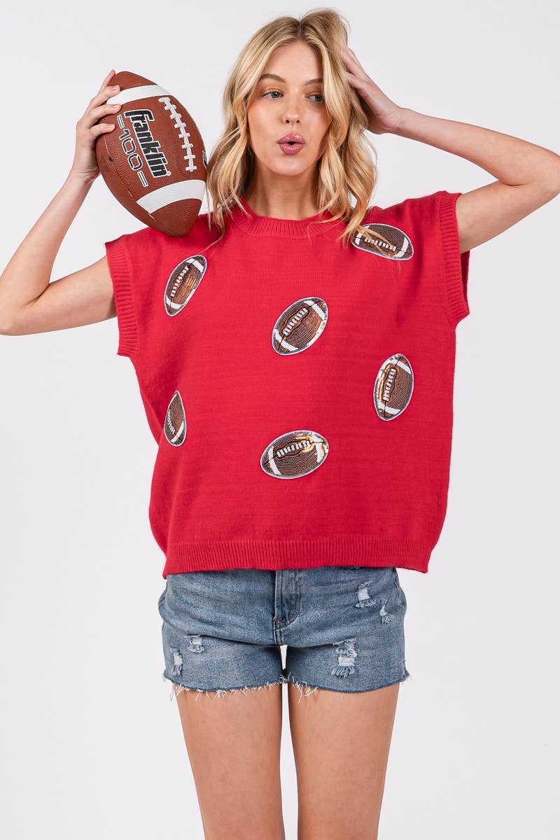 a cozy and sporty addition to your game day attire. Crafted with attention to detail, this sweater top features football patch designs that add a playful and athletic touch to your look.The football patch designs create a fun and spirited look, making this top a standout piece for any sports fan.