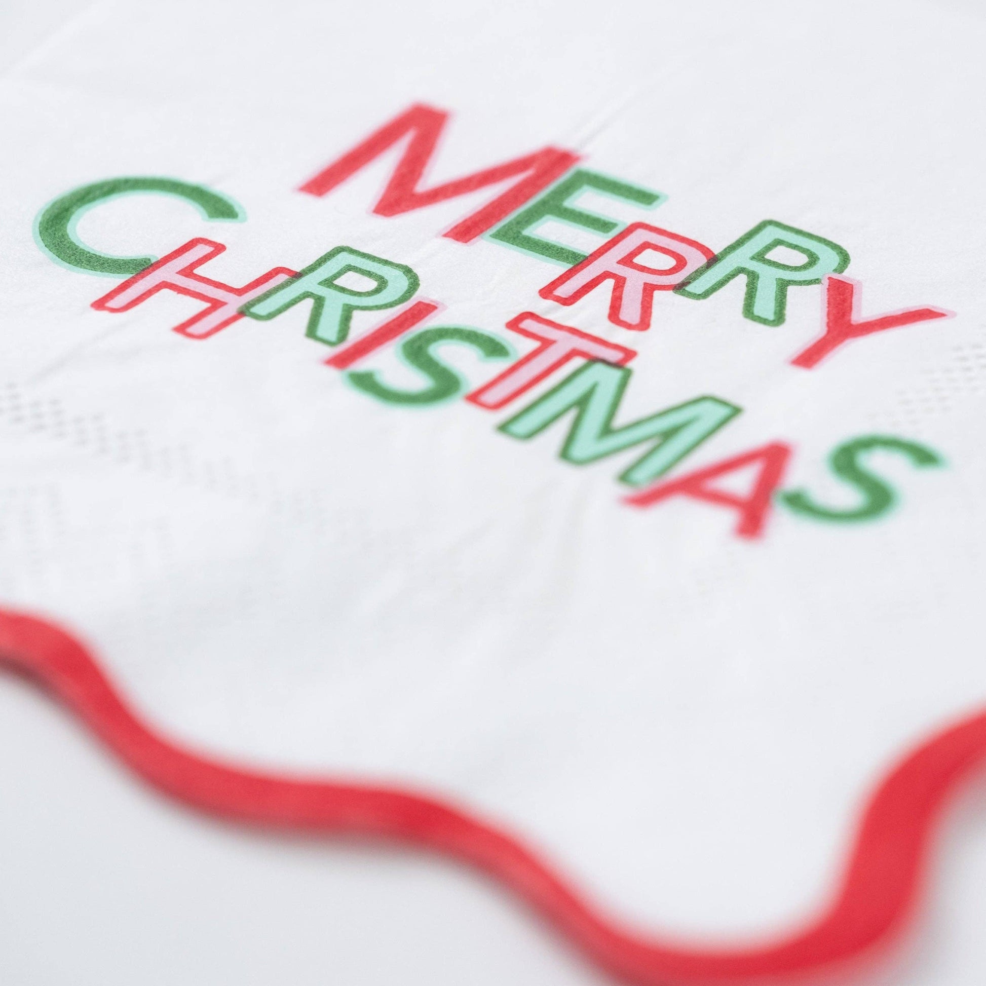Spread the joy with our playful and modern Merry Christmas Napkins! Featuring bold red and green block lettering with a festive wavy trim along the border, these napkins add a pop of personality to your holiday table. Whether you're hosting a cozy cookie exchange, a colorful Christmas brunch, or a whimsical Nutcracker-themed party, these napkins are a perfect match for our Cheerful Collection, Gingerbread Partyware, or Nutcracker Holiday Line.