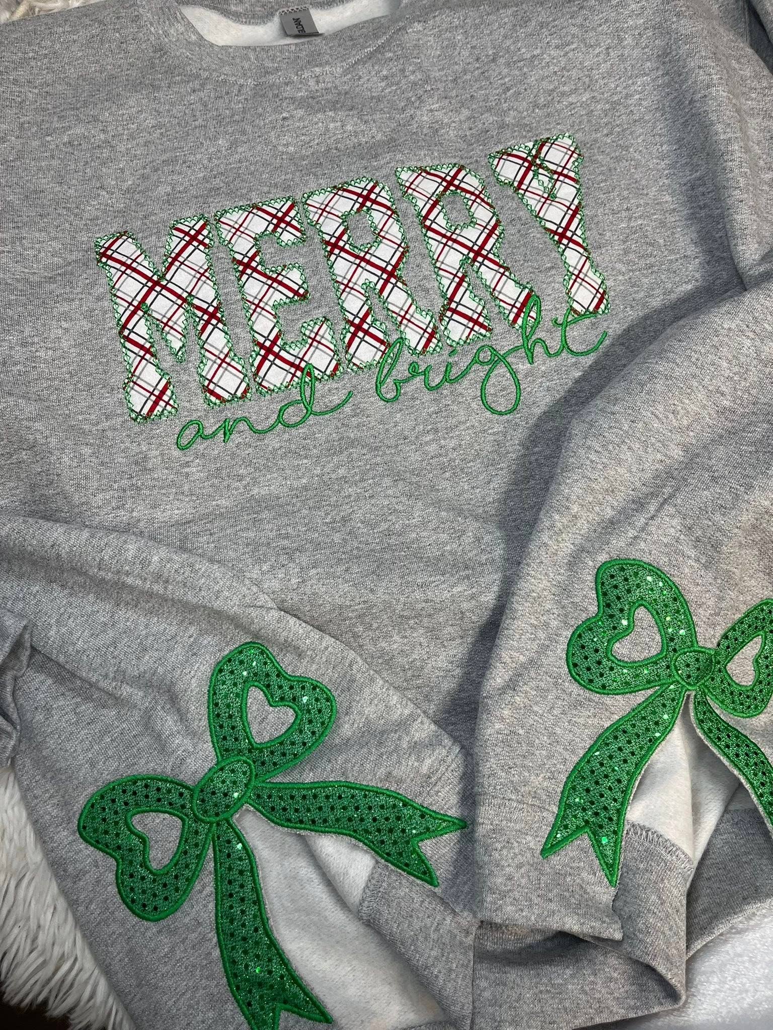 MERRY AND BRIGHT, SIDE BOW APPLIQUE EMBROIDERED SWEATSHIRT