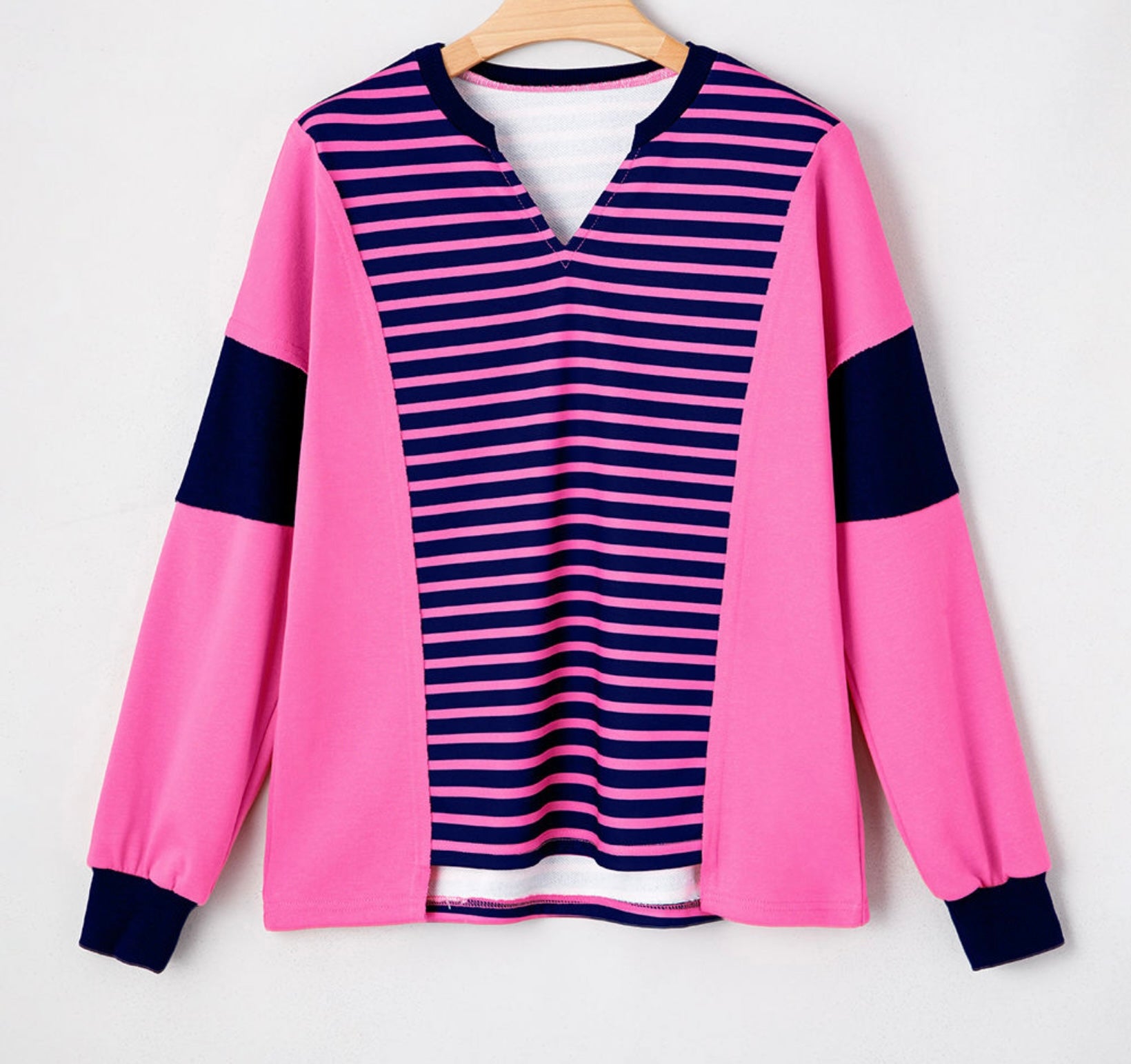 Pink & Navy V Neck Stripe Long Sleeve Top