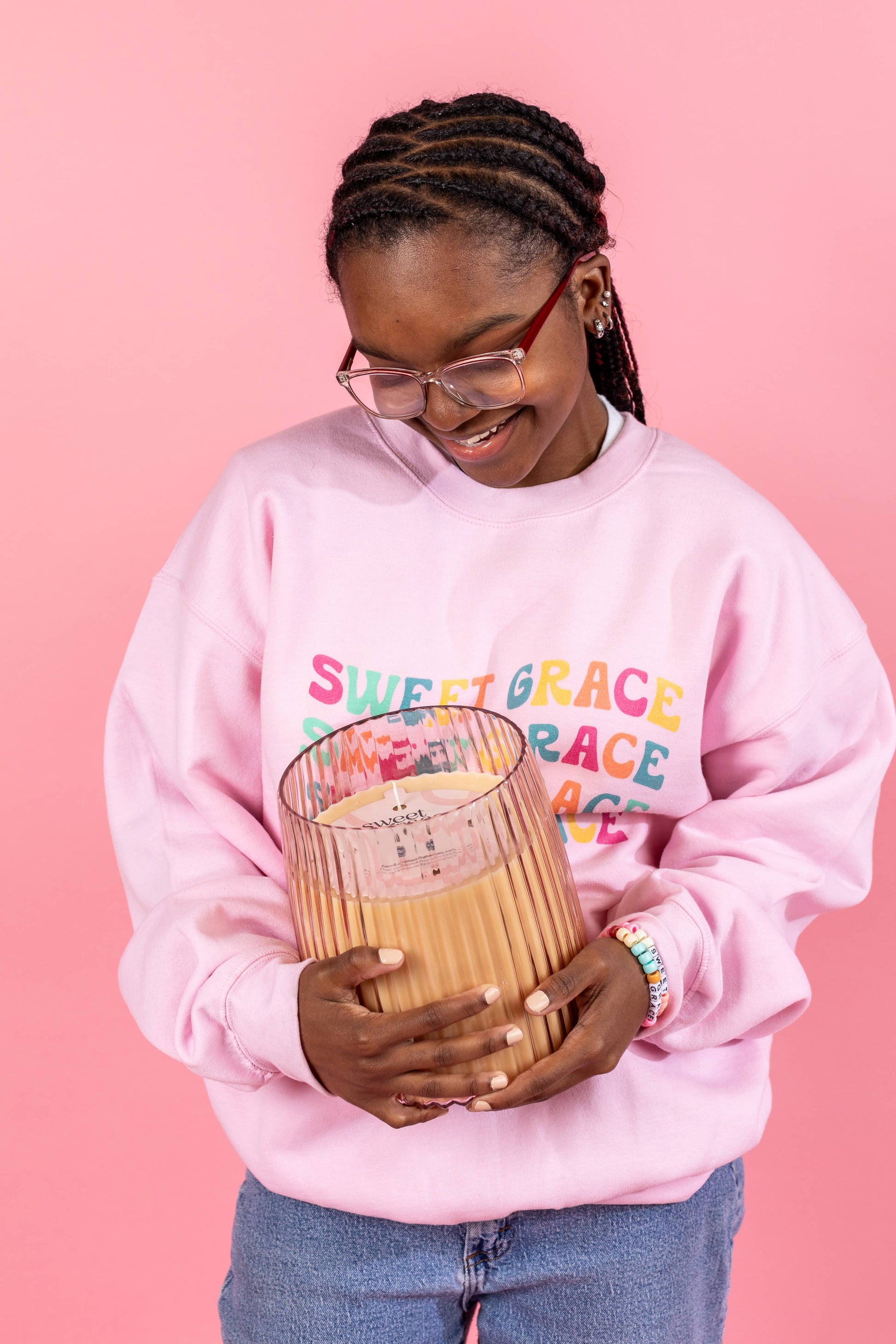 Our biggest Sweet Grace candle yet! This bold, beautiful vessel is quite the statement piece with its rosy hue, rippled texture, 108.7 oz of soy-blend wax, and FIVE lead-free cotton wicks. Sweet Grace is beloved for its blend of bright, fruity top notes, sparkling tea middle notes, and classic patchouli base. Light this candle to enjoy up to 275 hours of our #1 fragrance while also providing three healthy meals to a child in need.
