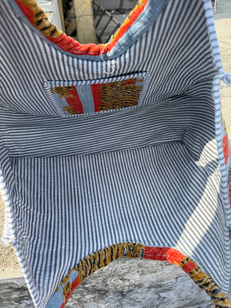 Velvet quilted travel bag made by Indian Artisans, This Velvet quilted shopping bag is totally unique and multi purpose. Use this for your grocery or as a travel bag. Perfect to suit everyone.